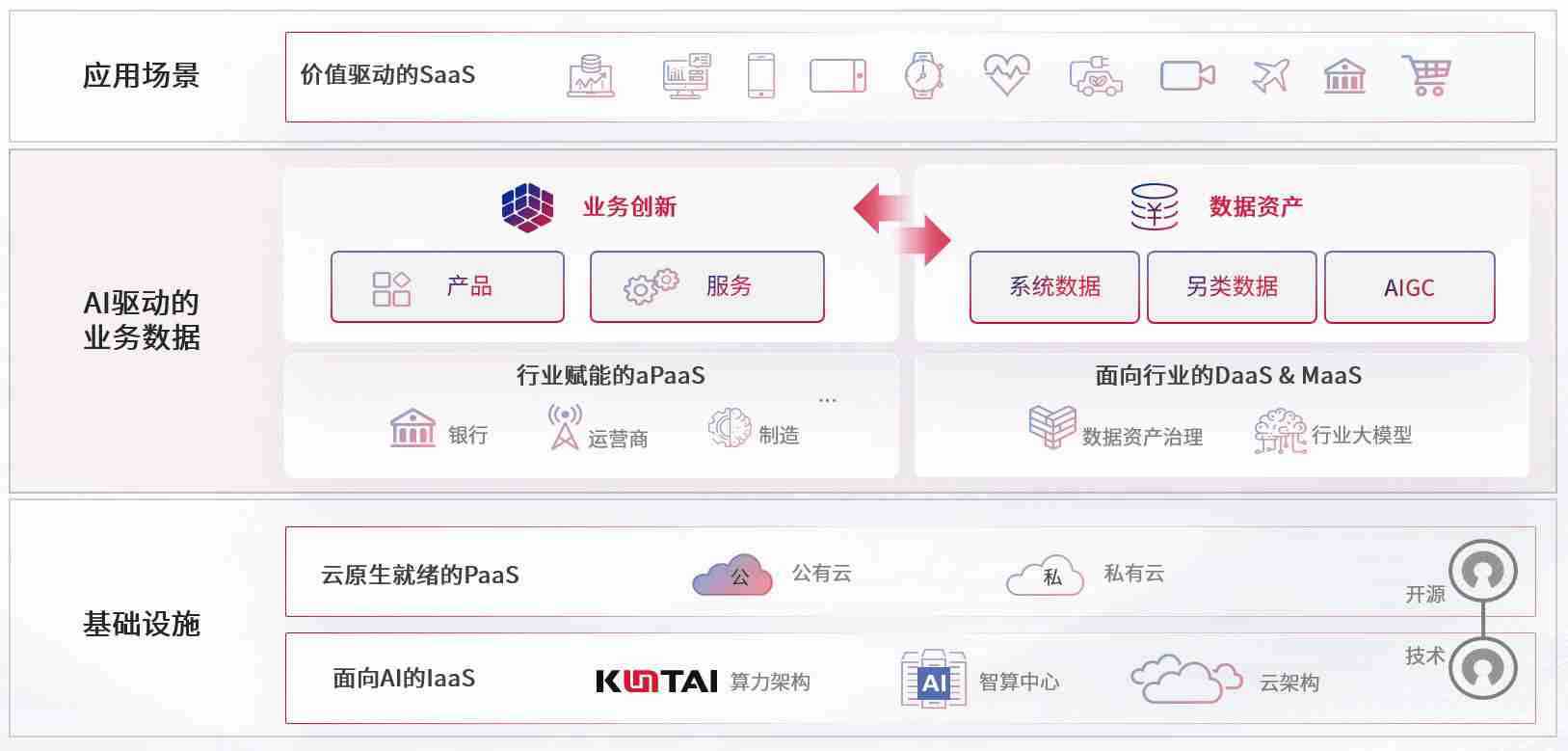 数字时代,,,,围绕企业数字化转型的关键要素,,z6com尊龙凯时数码开创性的提出数云融合战略和技术体系框架,,着力在云原生、、、数字原生、、、、AI原生和信创产业上架构产品和服务能力,,为处在不同数字化转型阶段的快消零售、、、、汽车、、、、金融、、、医疗、、政企、、教育、、、运营商等行业客户提供泛在的敏捷IT能力和融合的数据驱动能力,,,,构建跨界融合创新的数字业务场景和新业务模式,,,助力企业级客户建立面向未来的核心能力和竞争优势,,全面推动社会的数字化、、、、智能化转型升级。。。。